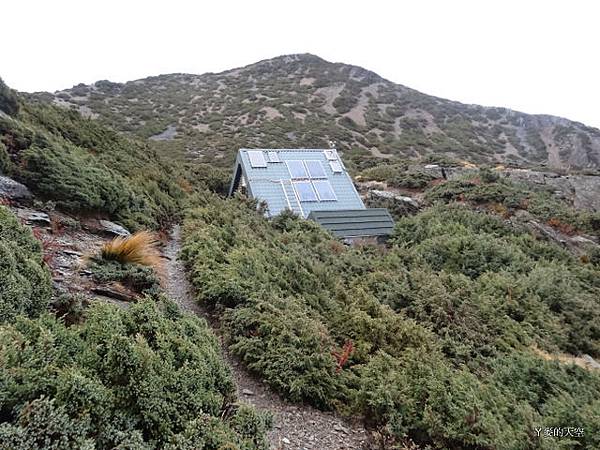 圓峰山屋在望,可以好好休息一晚了,山屋位於玉山主峰南稜上海拔3640公尺。