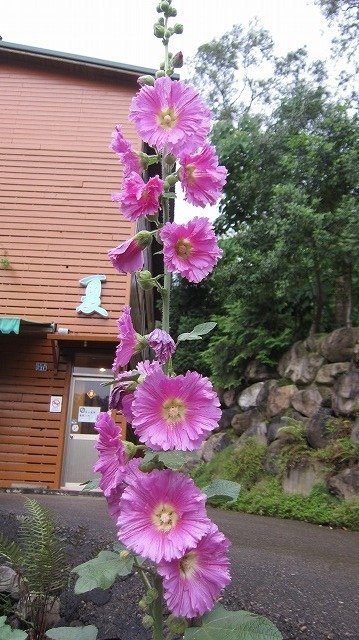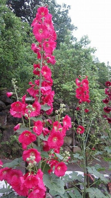 一丈紅蜀葵開滿莖,鮮麗的花朵隨風搖曳,風情無限。
