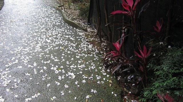 四月桐花開在高高的樹梢頭,落花飄落滿步道。