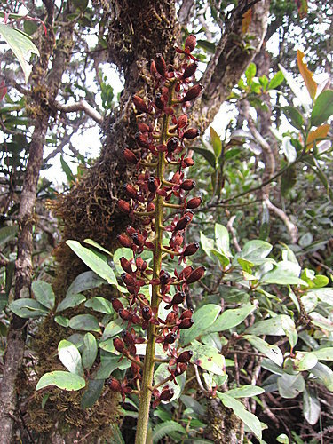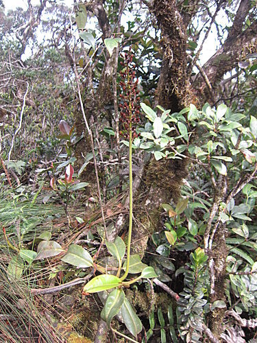 好不容易發現一株開花的豬籠草,豬籠草花為雌雄異體,從莖頂抽出一根高
