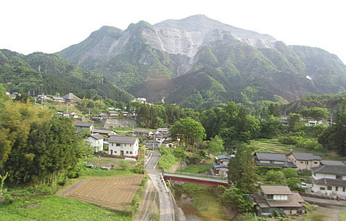 接近西武秩 父時的窗外,一座奇特的山岳 ,山峰上端廣大面積的凹陷,引起大家的好奇。