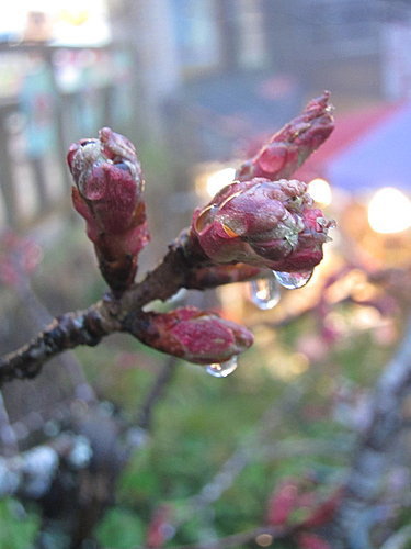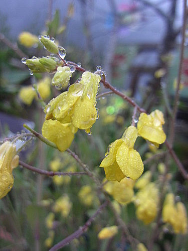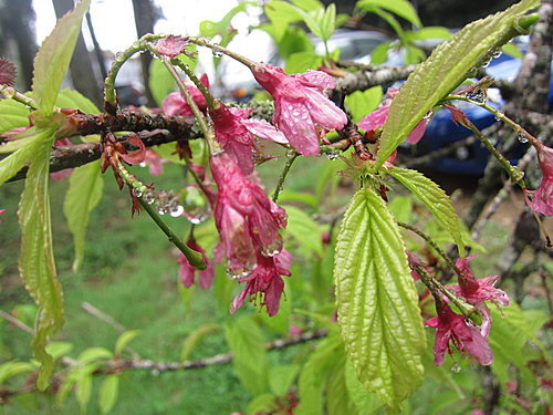 細長,花朵盛開時成串佈滿枝頭 ,霧雨中晶瑩。