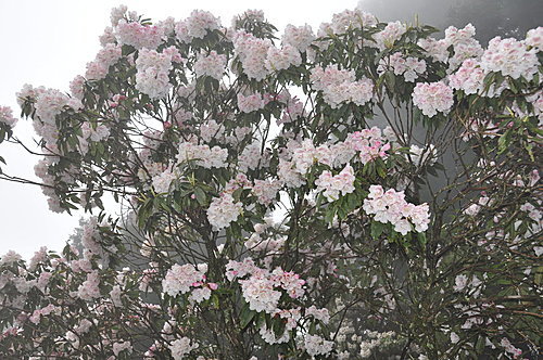 不 是四五月才開花嗎?,阿里山的森氏杜鵑早已開滿樹梢頭。