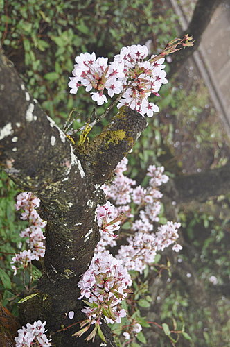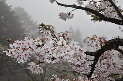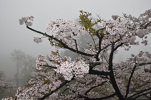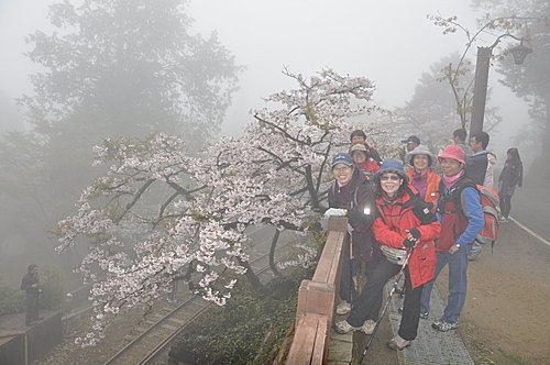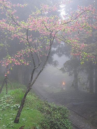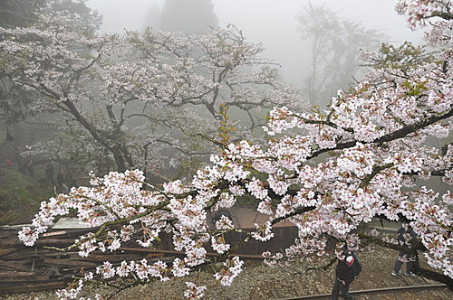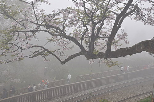 經過昭平車站鐵路上方,吉野櫻已經全數綻放。阿里山區霧氣瀰漫,遊客沒有想像的多。