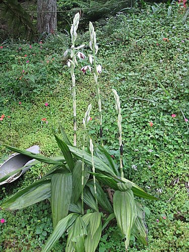 地。春季開花,花莖側生直立粗狀,每根花莖約有10至20朵花。葉形表面有波浪行皺摺。