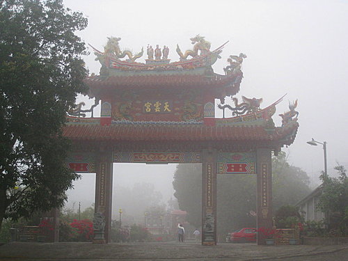 雲霧繚繞的天雲宮,在海拔720公尺的茶頂山上,天雲宮右上方有一大片的茶園,這是茶頂山