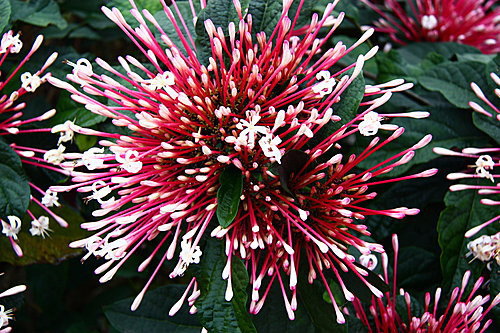 煙火花又名星爍山茉莉,株高約四公尺,花頂生,聚繖管狀花序,微管紫紅色,花朵潔白。