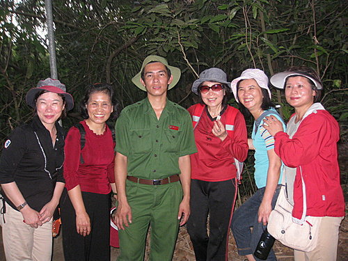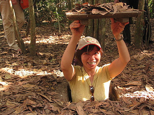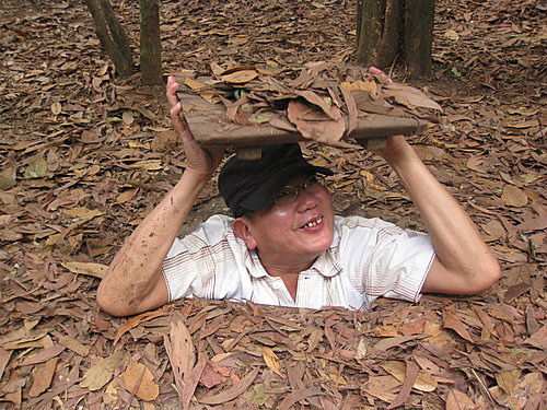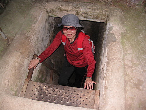 勉強[塞]入地道,辛苦。難怪當年高大的美軍卡在洞口,進退不得。