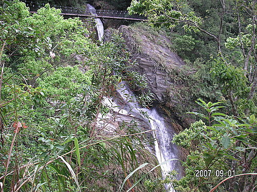 瀑布從山上高處 傾洩而下 流向溪谷深處 站在橋上觀瀑 也能感受到陣陣