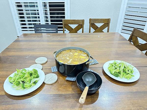 夫妻倆分工合作,一個煮湯品,一個炒菜。