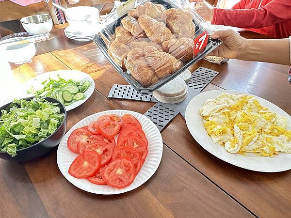 可頌麵包夾荷包蛋、小黃瓜、番茄、蔬菜配牛奶,青脆清爽又美味。