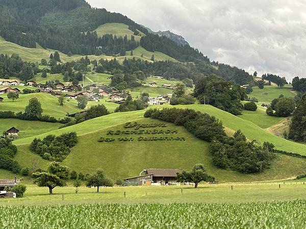 伯尼爾州弗魯第根下西門塔爾行政區的一個市鎮,綠色山坡上有字,