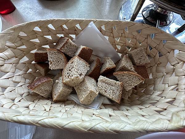 晚餐是瑞士起司火鍋餐佐~主菜加瑞士巧克力鍋甜點。切成小塊的麵包。