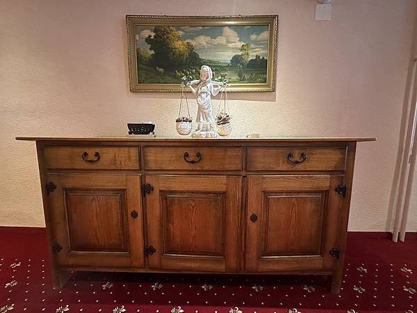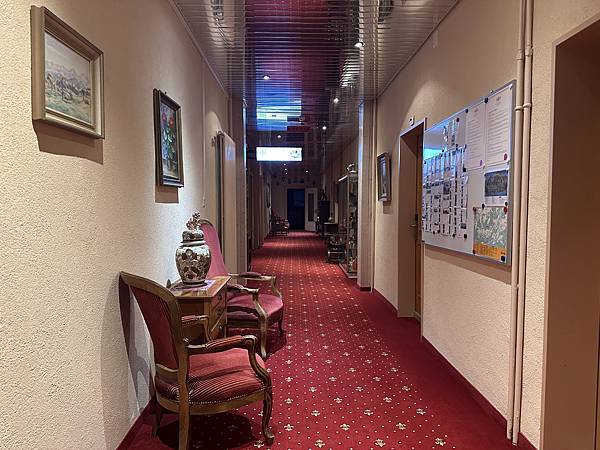 客房長廊,紅椅、紅地毯,兩側牆上有許多畫作。