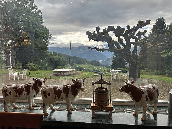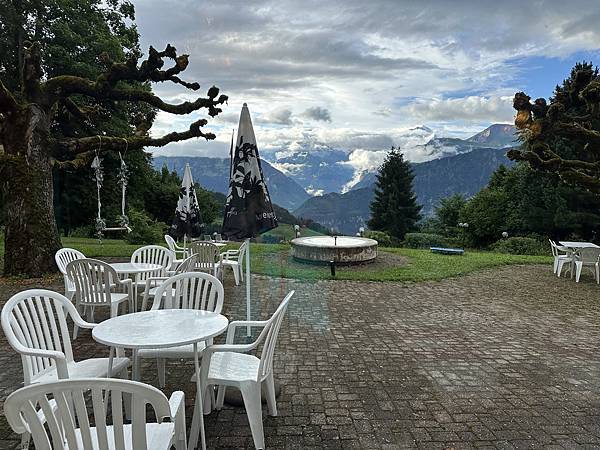 戶外的用餐區,有噴泉,、鞦韆,遠眺阿爾卑斯山的群峰。